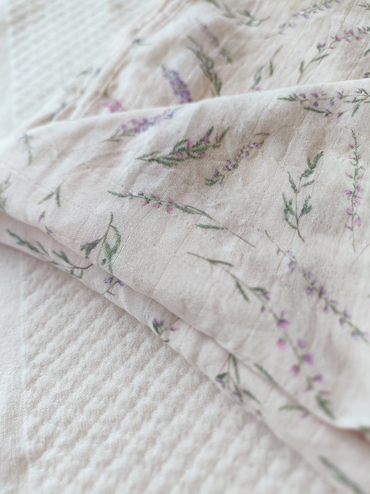Delicada sabana de muselina de bambú orgánico, extra suave, hipoalergénica, protege de los rayos uv, especial para pieles sensibles, absorbe la humedad y los olores manteniendo así la piel fresca y seca.