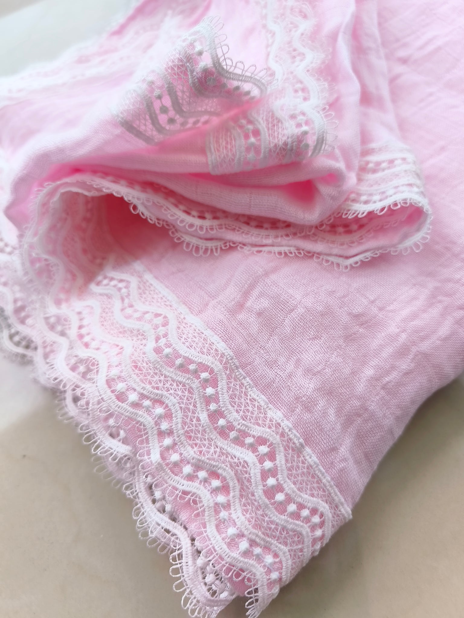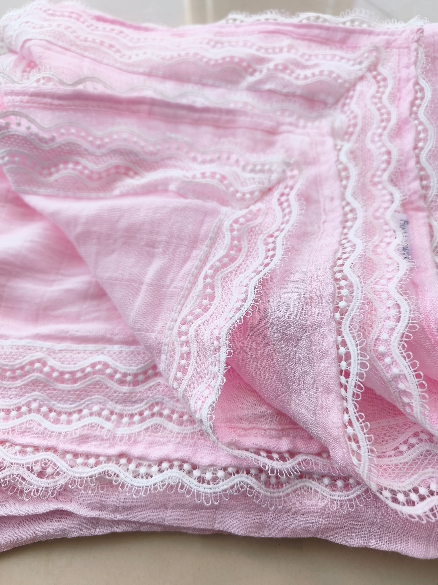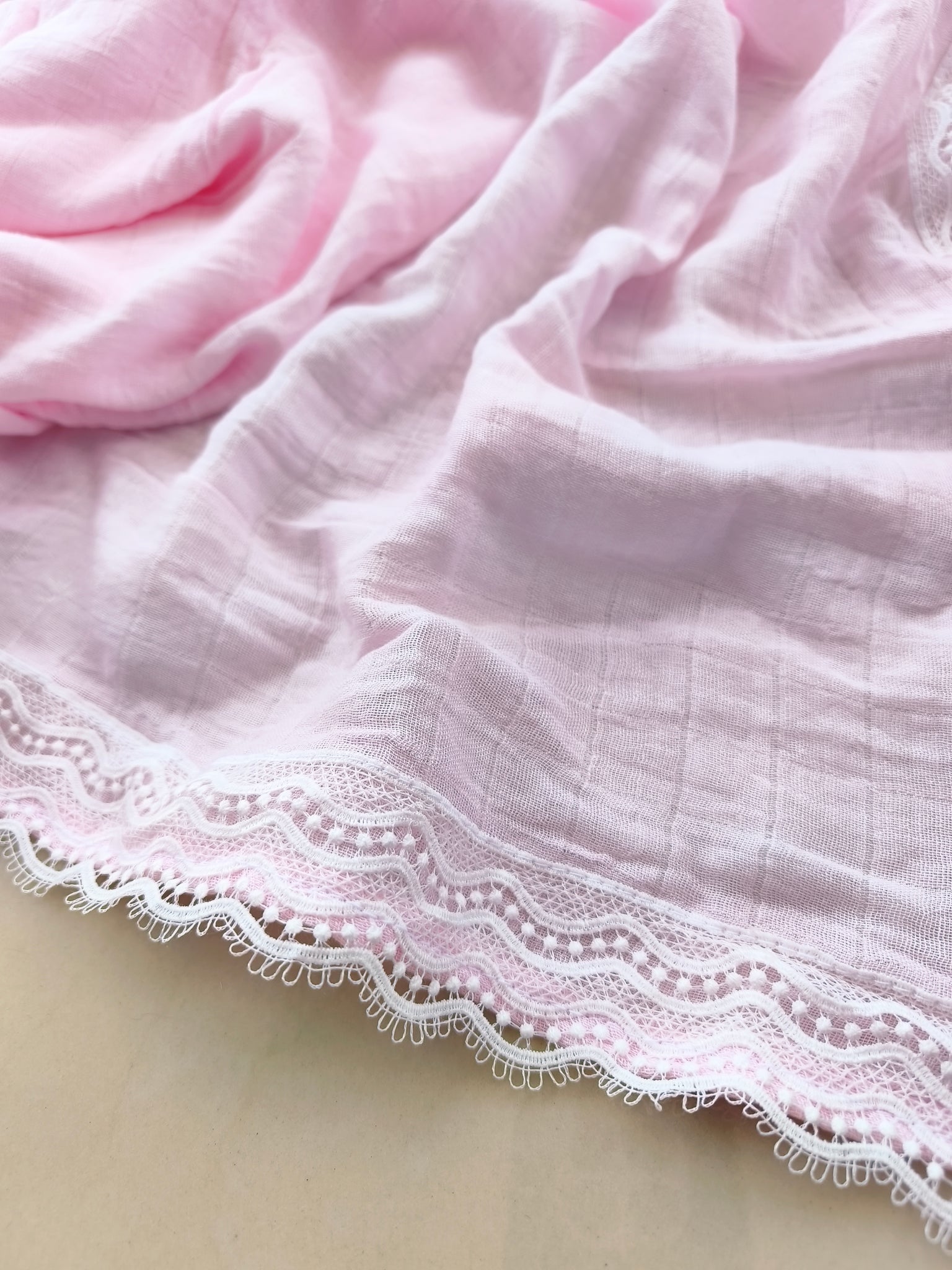Delicada sabana de muselina 100% bambú con orilla de guipiur. Hipoalergénica, antibacterial protege de los rayos uv, especial para pieles sensibles, absorbe la humedad y los olores manteniendo así la piel fresca y seca.