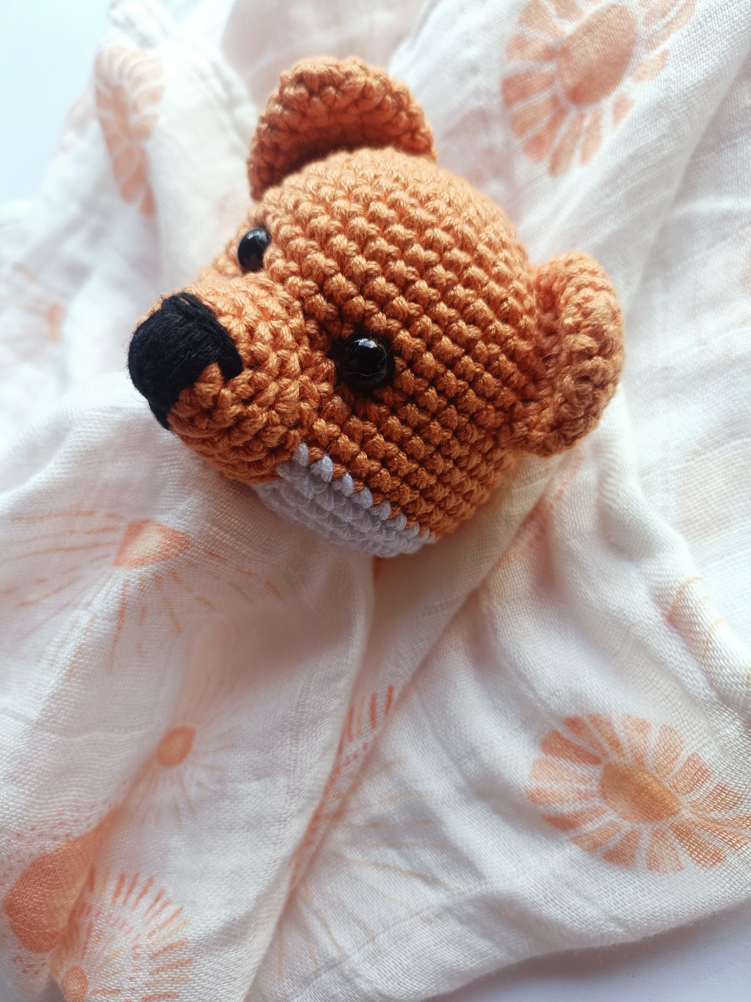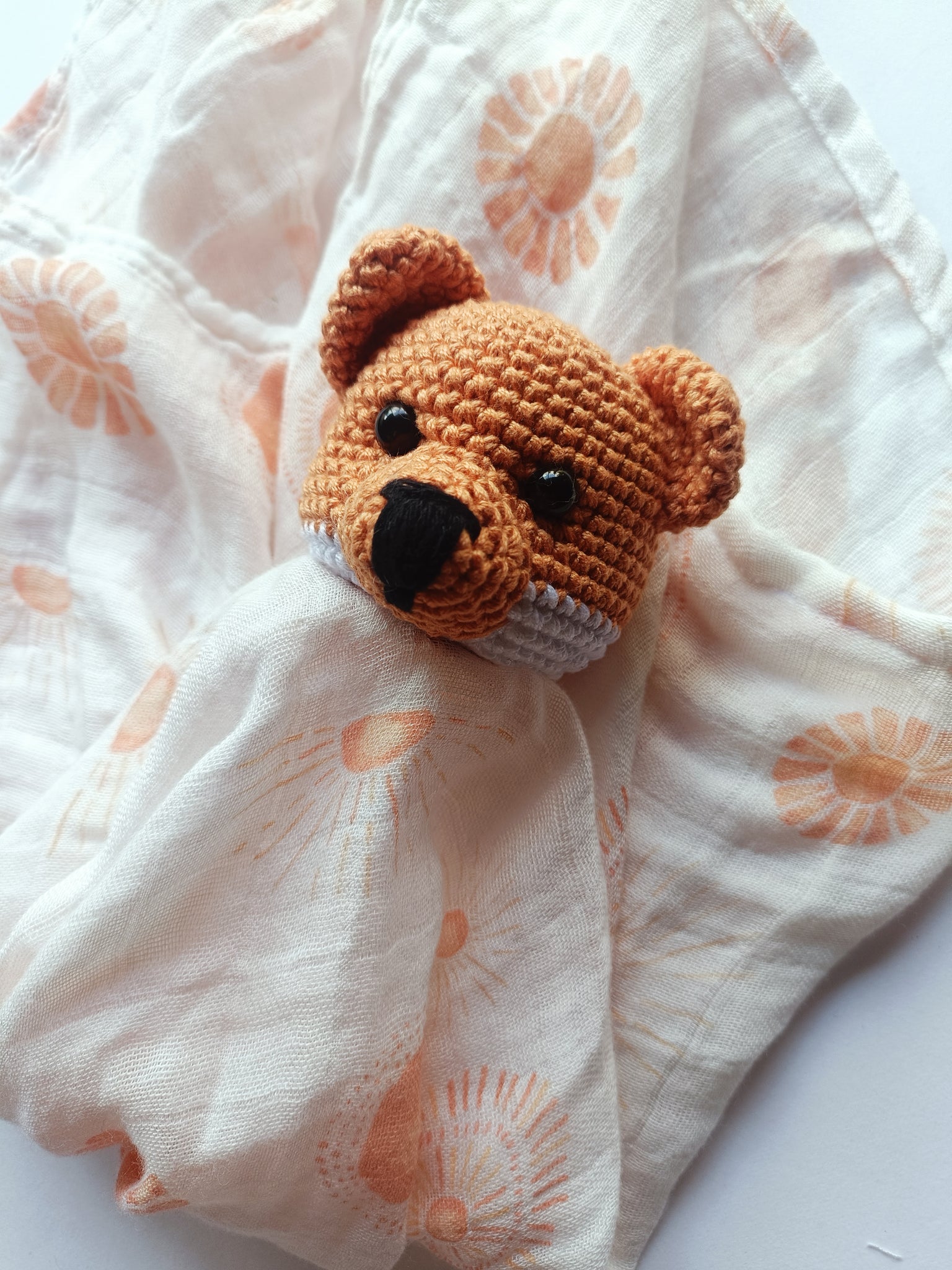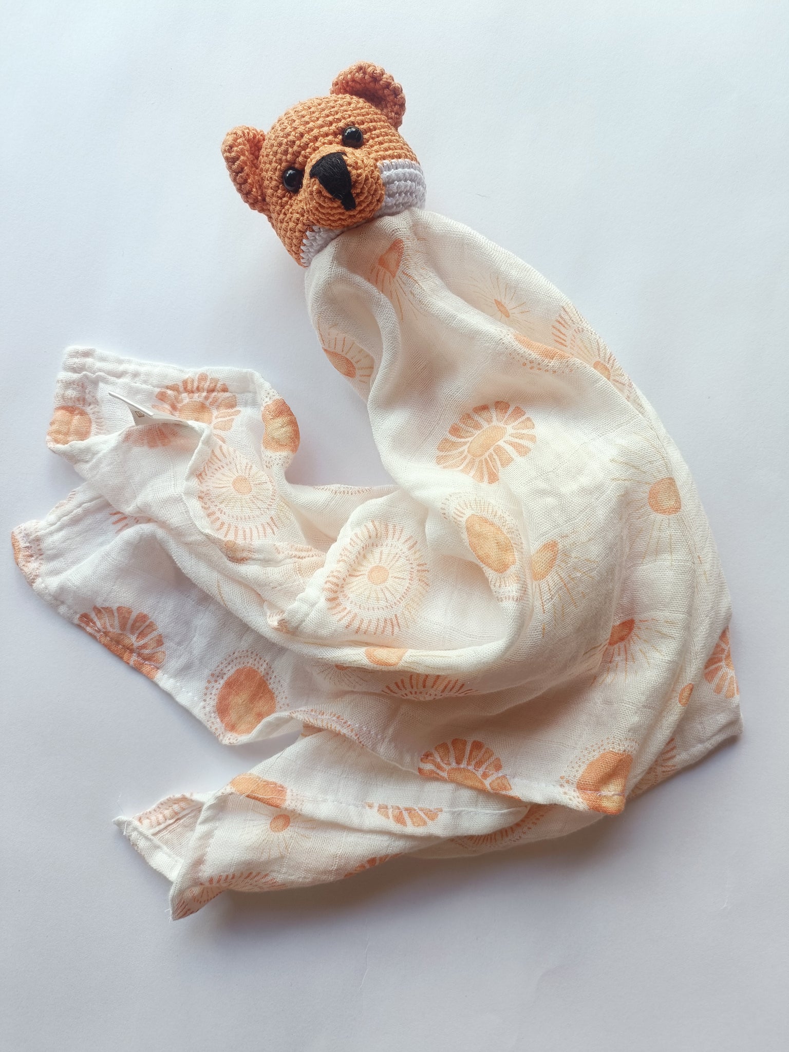 Delicada sábana de muselina de bambú orgánico , suave y transpirable   hipoalergenica,protege de los rayos uv, especial para pieles sensibles, absorbe la humedad manteniendo así la piel fresca y seca con un  conejito de crochet 100%algodón.